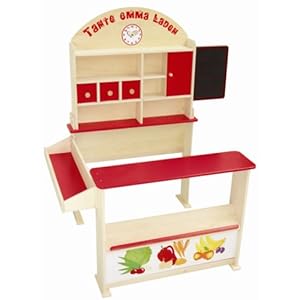 92802 Verkaufsstand Höhe 113 cm, Breite 103 cm, Tiefe 75 cm, mit 3 Holzschubladen, 1 Schiebetüre, seitliche Theke, Seitentafel, Uhr und Schriftzug "Tante Emma Laden", Schichtholz und MDF, farbig lackiert, ab 3 Jahre Beschreibung: roba Kaufladen °Tante Emma° Guten Tag, was darf's denn heute sein?', heißt es fortan im familieneigenen Kaufmannsladen. Der Verkaufstand mit Seitentheke, Tafel, Uhr und Schubfächern bietet Ihrem Kind viel Raum für kreative Rollenspiele. Dank ihres großen Vorstellungsvermögens und Ideenreichtums verwandeln die kleinen Nachwuchskaufleute den traditionellen Kaufmannsladen ruck zuck in eine Konditorei, Schusterei oder einen Spielzeugladen. Dabei lernen sie im Rahmen der sozialen Interaktion, sich spielerisch in die unterschiedlichen Rollen von Kunde und Verkäufer zu versetzen und mit Produktarten, Mengen sowie Zahlen umzugehen. Passend hierzu bieten wir auch ein umfangreiches Kaufladenzubehör-Set an.