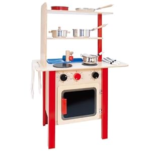 Dieser Kinderküche aus dem Hause Nemmer ist hochwertig verarbeitet und aus Birkenholz hergestellt. Sie ist in den Farben Natur und Rot gehalten. Die Spielküche ist von 3 Seiten bespielbar. Sie besitzt einen Herd, eine Spülmaschine, eine Spüle und zwei Herdplatten. Über der Arbeitsfläche ist noch ein Regal angebracht, in dem man praktisch das Zubehör unterbringen kann. (Zubehör ist nicht im Lieferumfang mit enthalten)