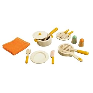 Unterstützen Sie die Kreativität Ihres Kindes und fördern Sie so die emotionalen und sozialen Fähigkeiten. Mit diesem hochwertigen, auf die Bedürfnisse der Kinder abgestimmten, Holzspielzeug bereichern Sie gezielt die Spiel- und Erlebniswelt Ihres Kindes. Im Set enthalten ist alles, was man zur Ergänzung und Erweiterung seiner Küche benötigt. Es besteht aus einem Topf mit Deckel, eine Pfanne, zwei Tellern, zwei Messern, zwei Gabeln, einem Kochlöffel, einem Pfannenwender, einem Salz- und einem Pfefferstreuer und einem Geschirrtuch. Küchenzubehör Geschirr - Dieses Set mit Kochtöpfen, Geschirr und Besteck sowie Salz- und Pfefferstreuer und Küchenhandtuch erfreut jeden kleinen Chefkoch. - 14 Teile