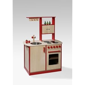 Große, stabile Spielküche aus Holz, teilweise rot lackiert. Die Küche ist mit 4 Herdplatten, Backofen mit beweglichen Knöpfen, Spüle mit Mischbatterie, Schrank mit Zwischenboden, 2 Schiebetüren und 3 Aufhängungen für Kochutensilien ausgestattet und dadurch bestens bespielbar. (ohne Dekoration). ACHTUNG! Nicht geeignet für Kinder unter 3 Jahren wegen verschluckbarer Kleinteile. Erstickungsgefahr!